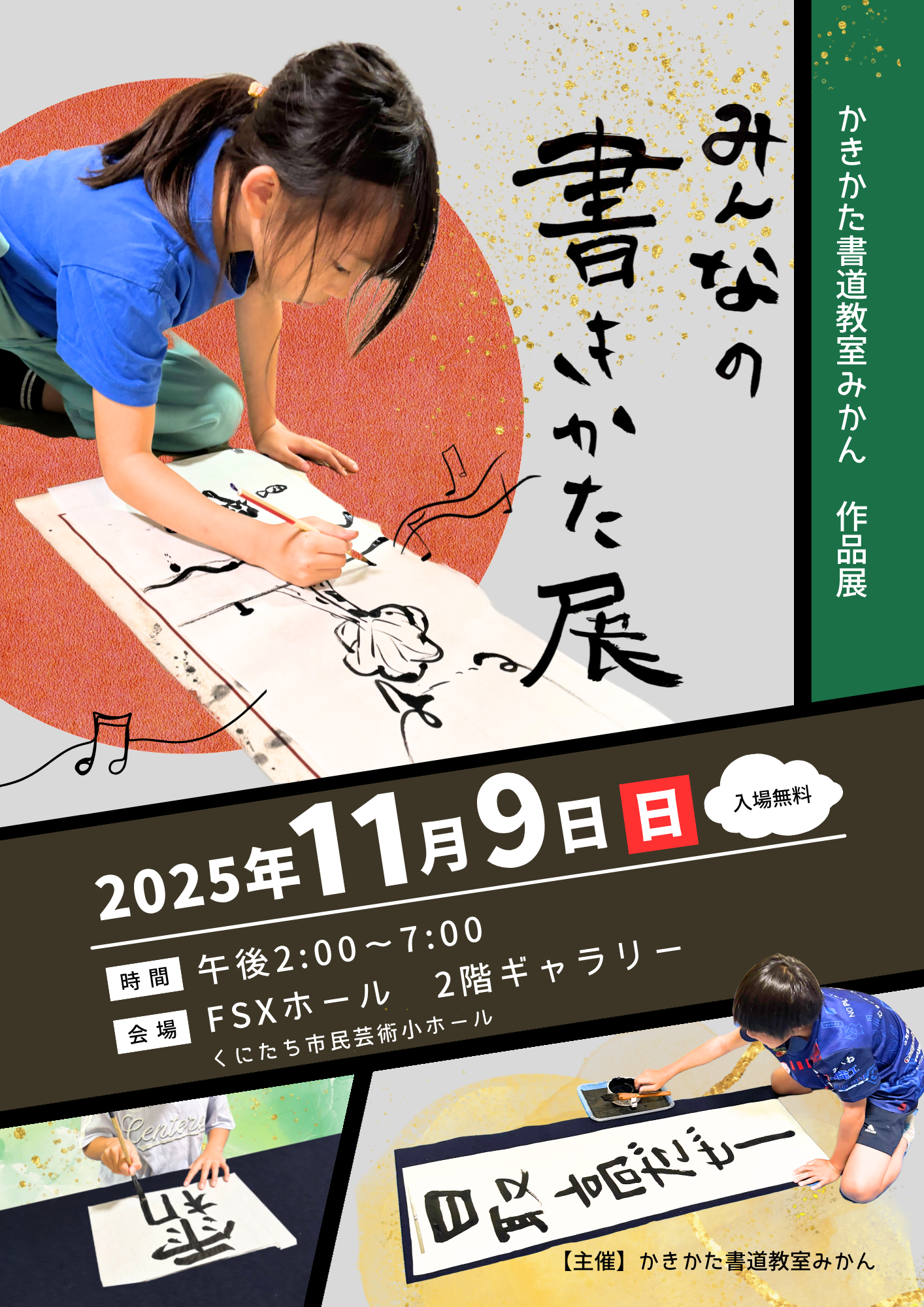 第二回 かきかた書道教室みかん教室展を開催します! 「みんなの書きかた展」 日時:2025年11月9日(日) 14:00〜19:00 場所:FSXホール(くにたち市民芸術小ホール) 2Fギャラリー 入場無料です⭐︎ |