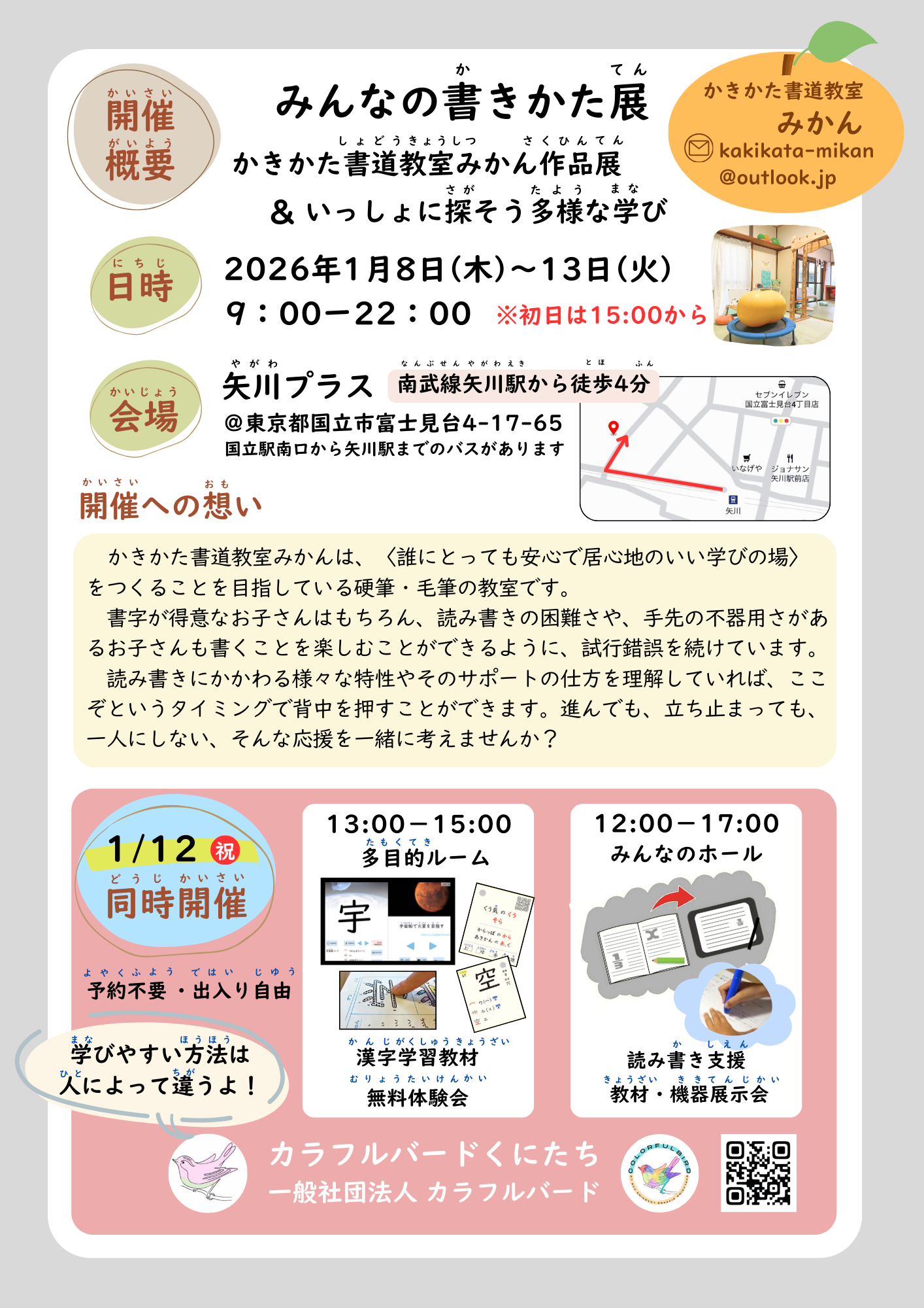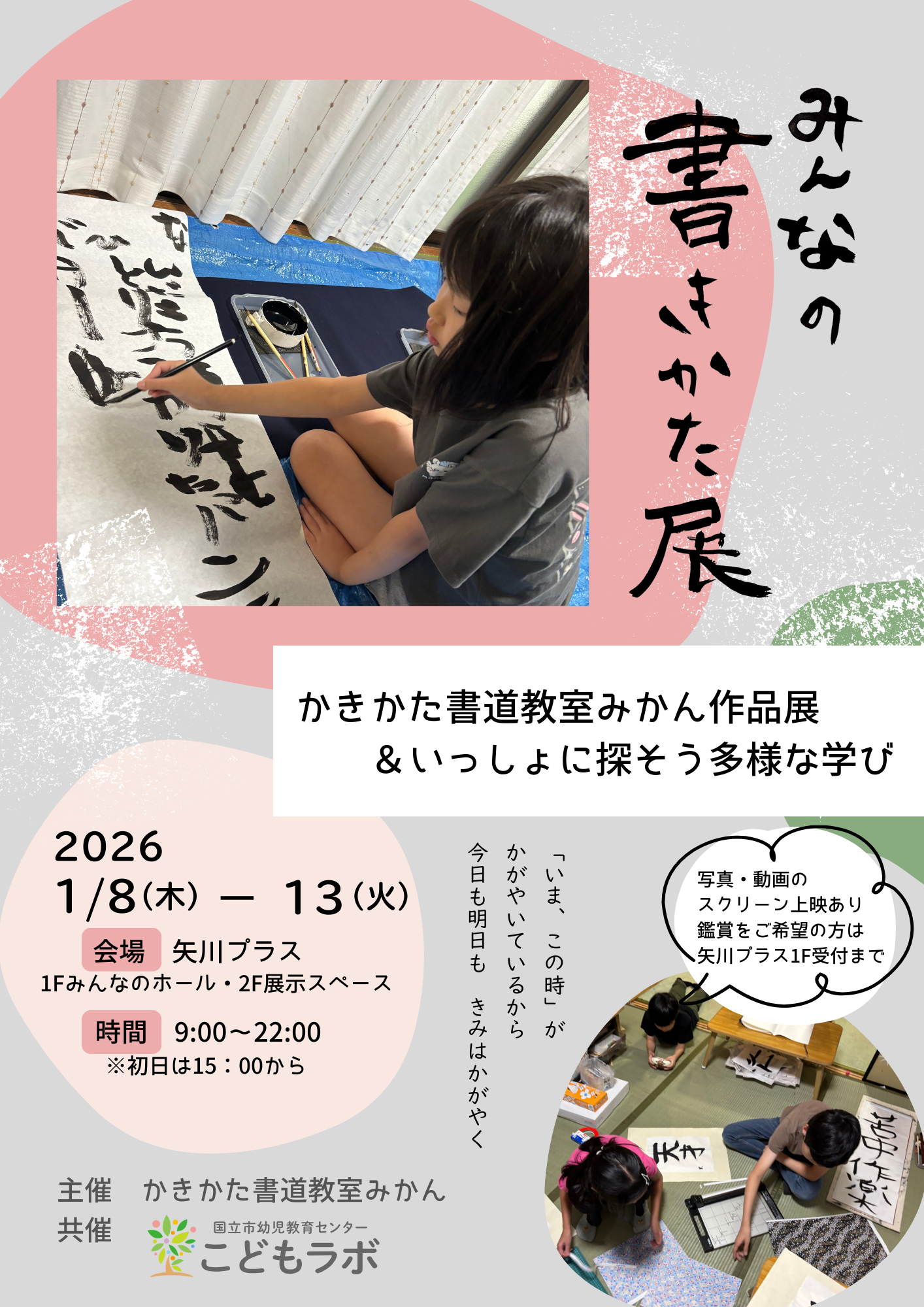 / みんなの書きかた展 & いっしょに探そう多様な学び \ 期間:2026年1月8日(木)〜13(火) 9:00〜22:00 ※初日は15:00〜 場所:矢川プラス 1階みんなのホール 2階展示スペース 詳細はチラシでご確認ください⭐︎ |